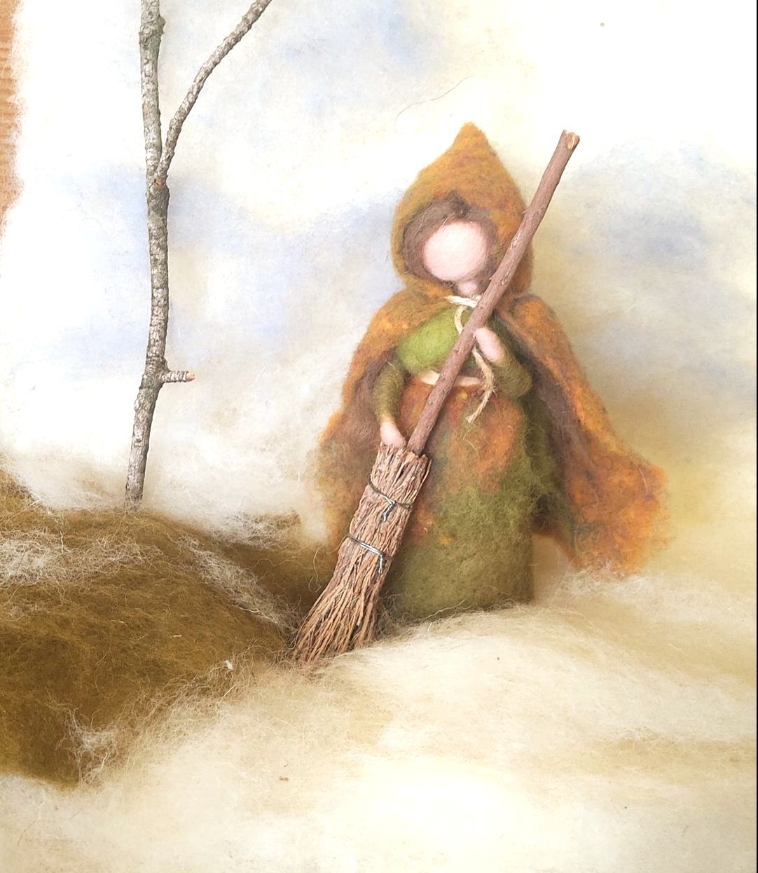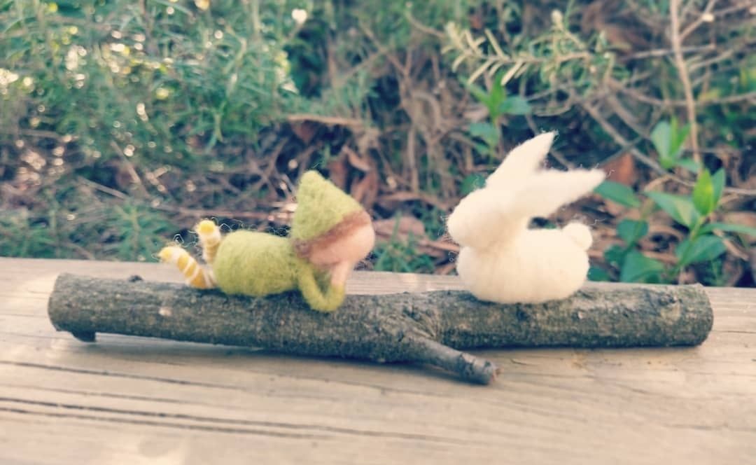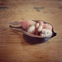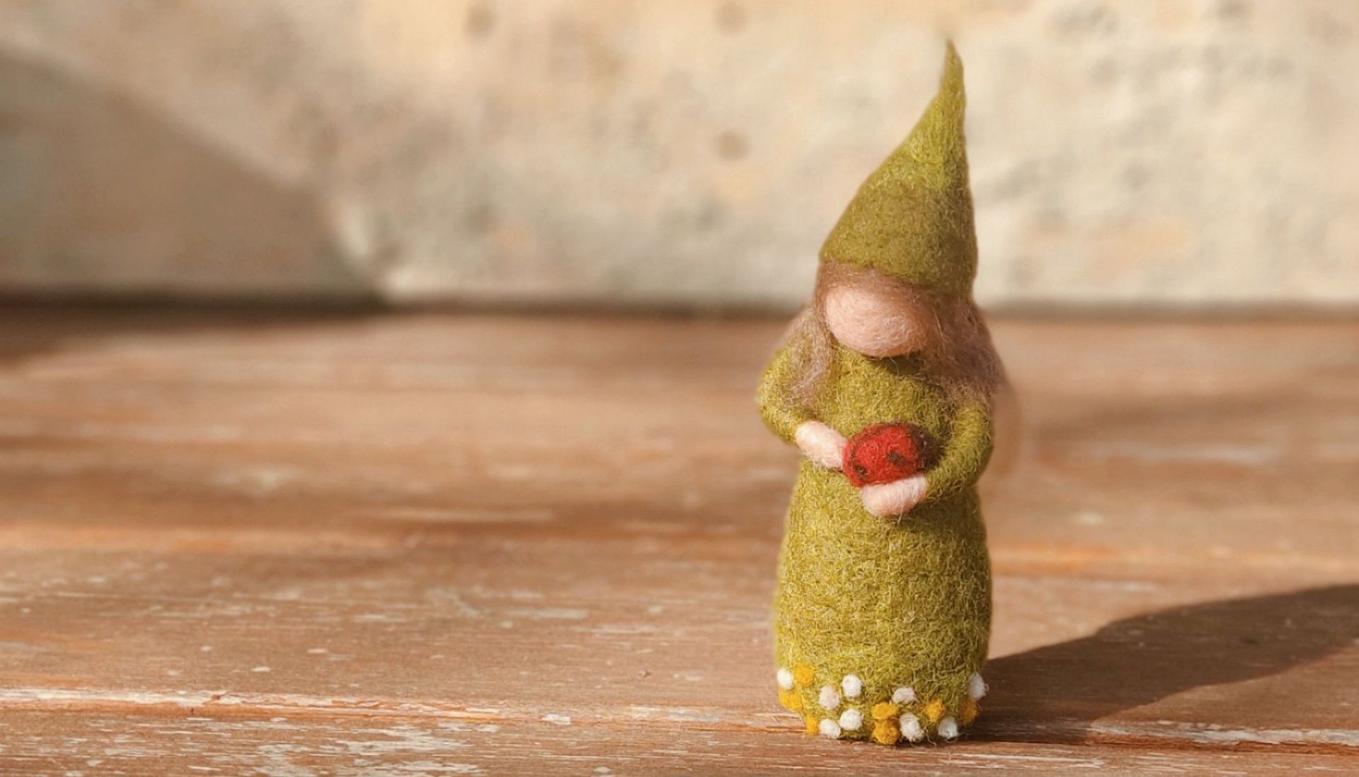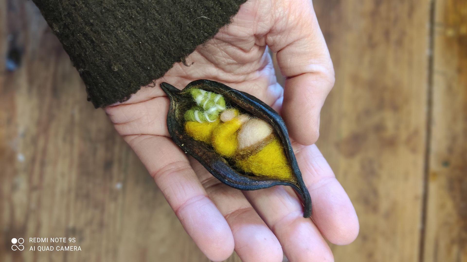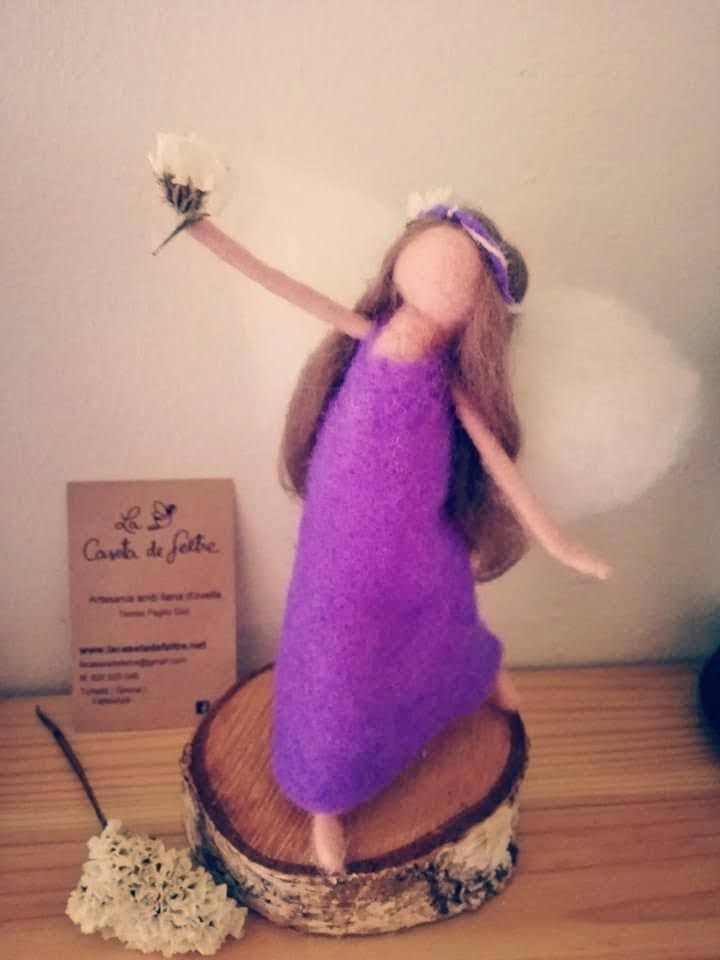 Figura hecha artesanalmente con lana cardada de oveja, enfieltrada manualmente con una aguja de enfieltrar.