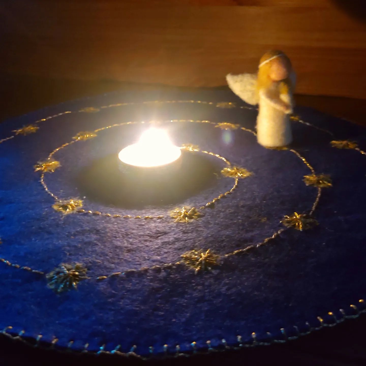 Con el calendario de Adviento vivimos la llegada de la Navidad siguiendo el recorrido de la espiral de las estrellas con un ángel que lleva la luz en sus manos. Y va adelantando cada día por una de ellas hasta llegar la noche del 24 al centro. es entonces cuando iluminamos con una vela.