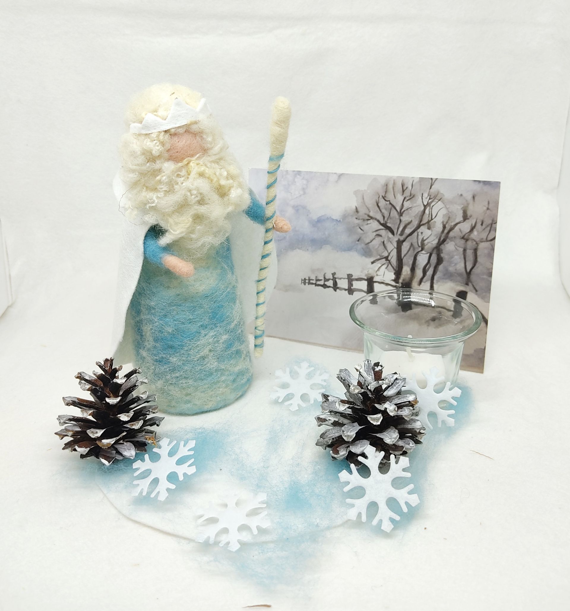 La Caja de estación de invierno que le ofrezco contiene los elementos principales para empezar a crear tu espacio del invierno. A partir de aquí ya medida que vaya adelantando la estación puedes ir añadiendo diferentes elementos que tengas en casa o que encuentres en la naturaleza. Un cuento del invierno, un mineral, una fotografía....